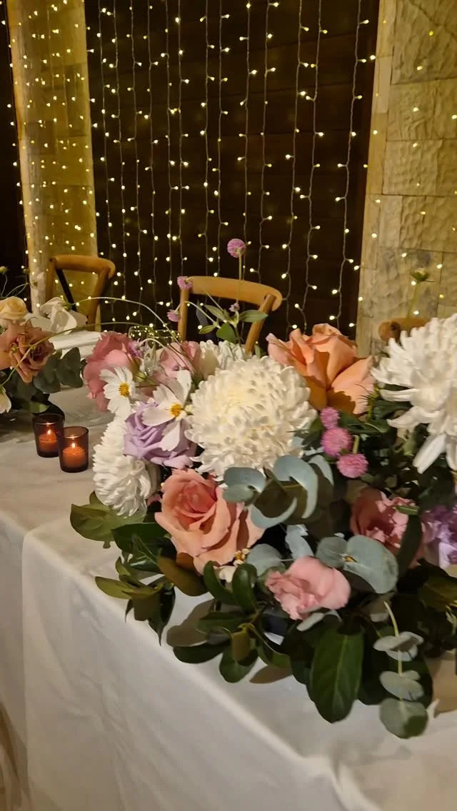 Bridal table, guest table centrepieces, cake table flowers, bar flowers, etc